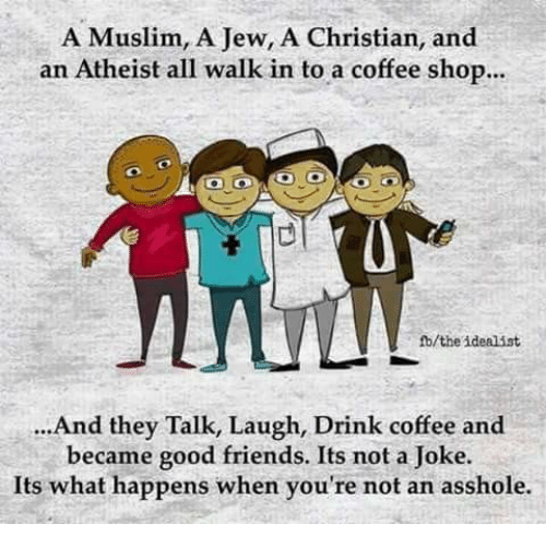 This is what the world wants, don’t we? We want to be able to talk, laugh, drink coffee and become good friends, irrespective of dearly held beliefs. It’s not what the world sees in the news, but everyday there are acts of hospitality and generous friendship that span the separateness of people’s beliefs.