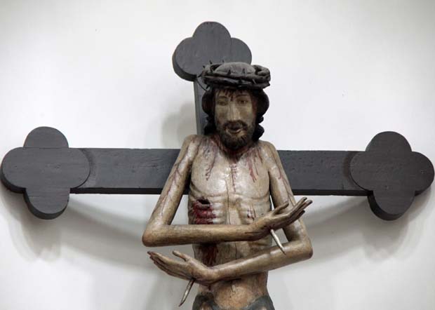 But what set this Jesus apart is that his arms are no longer fixed to the cross. They reach out, defining a space into which the viewer appears invited. Therein lies the horror: the crude spikes meant to pin his hands to the crossbeam remain buried in his palms.