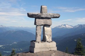 “An Inuksuk is a figure made of piled stones or boulders constructed to communicate with humans throughout the Arctic. Traditionally constructed by the Inuit, inuksuit (plural) are integral to Inuit culture and are often intertwined with representations of Canada and the North… In Inuktitut, the term inuksuk means “to act in the capacity of a human.” It is an extension of the word inuk meaning “a human being.” Inuksuit have been found close to archaeological sites dating from 2400 to 1800 BCE…