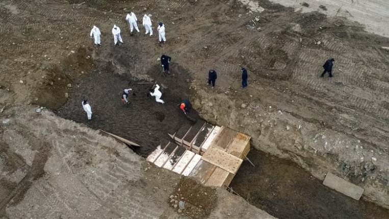 Workers bury bodies in a trench on Hart Island on April 9, 2020 in the Bronx borough of New York City. (John Minchillo/The Associated Press)