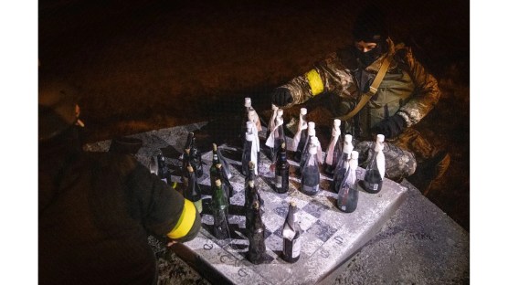 “Two weeks after Russian forces illegally invaded Ukraine, photos of a game of chess played by members of the Territorial Defence unit, charged with guarding a barricade on the outskirts of eastern Kyiv after curfew, went viral. What was so compelling about the midnight match, apart from the outsized board on which the game was being played on a patch of dirt in the freezing cold? The pieces had been fashioned not from wood, ivory, resin, or plastic as is typical, but lethal Molotov cocktails – pointedly typifying the huge and incendiary stakes of the new war.”